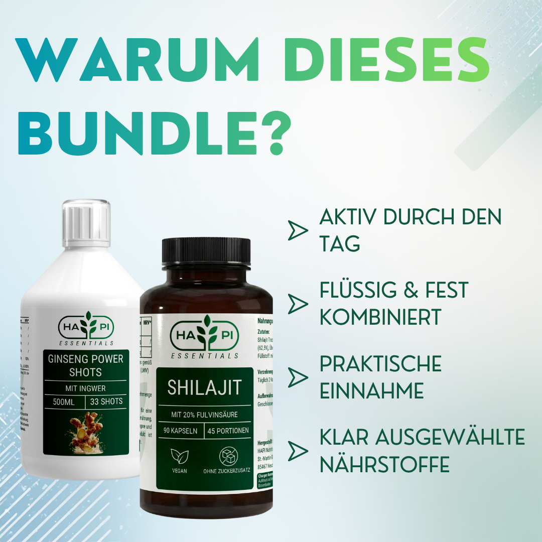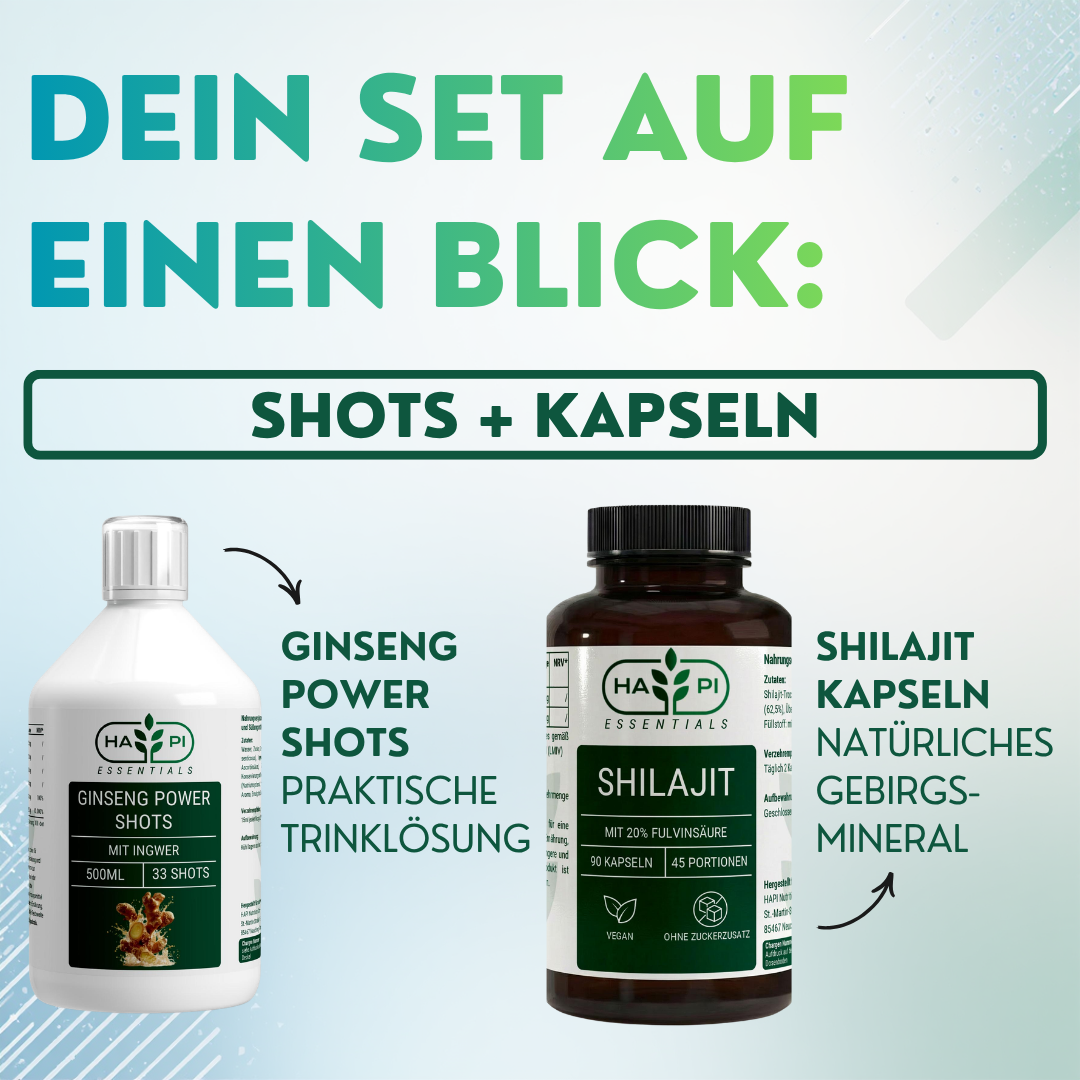 Early Bird Bundle – zwei Produkte für den Morgen in unterschiedlichen Formaten: Ginseng Power Shots (500 ml) als praktische Trinklösung sowie Shilajit (20% Fulvinsäure) Kapseln (90 Stk.) aus natürlichem Gebirgsmineral.
