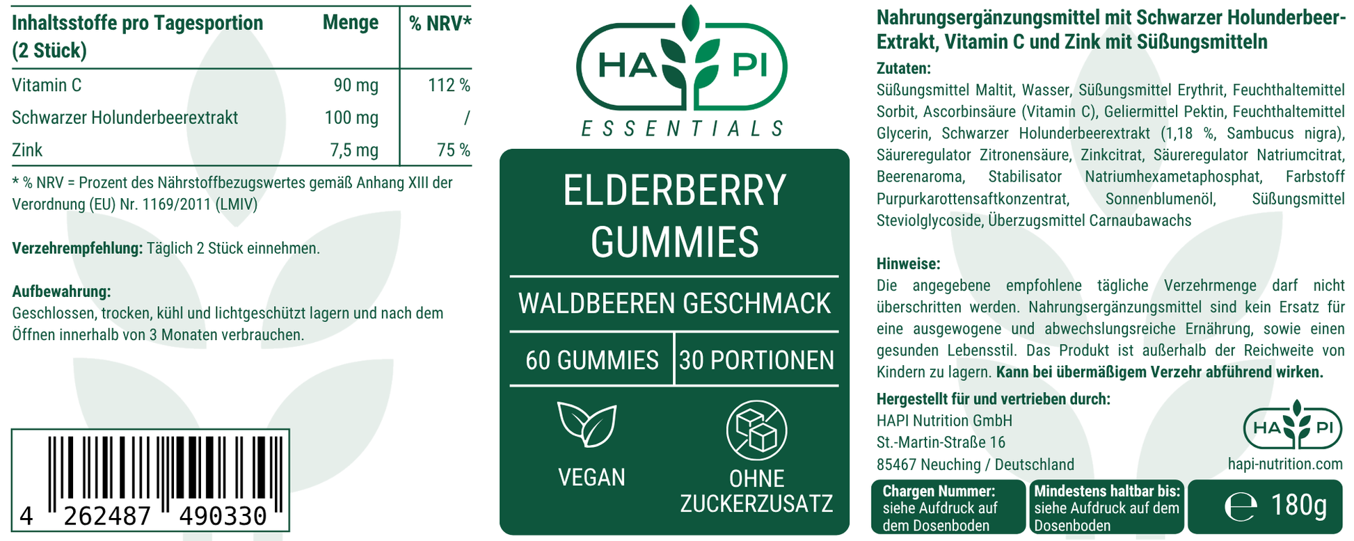 Süßungsmittel: Maltit, Wasser, Süßungsmittel: Erythrit, Feuchthaltemittel: Sorbit, Ascorbinsäure (Vitamin C), Geliermittel: Pektin, Feuchthaltemittel: Glycerin, Schwarzer Holunderbeerextrakt (1,18 %, Sambucus nigra), Säureregulator: Zitronensäure, Zinkcitrat, Säureregulator: Natriumcitrat, Beerenaroma, Stabilisator: Natriumhexametaphosphat, Farbstoff: Purpurkarottensaftkonzentrat, Sonnenblumenöl, Süßungsmittel: Steviolglycoside, Überzugsmittel: Carnaubawachs.