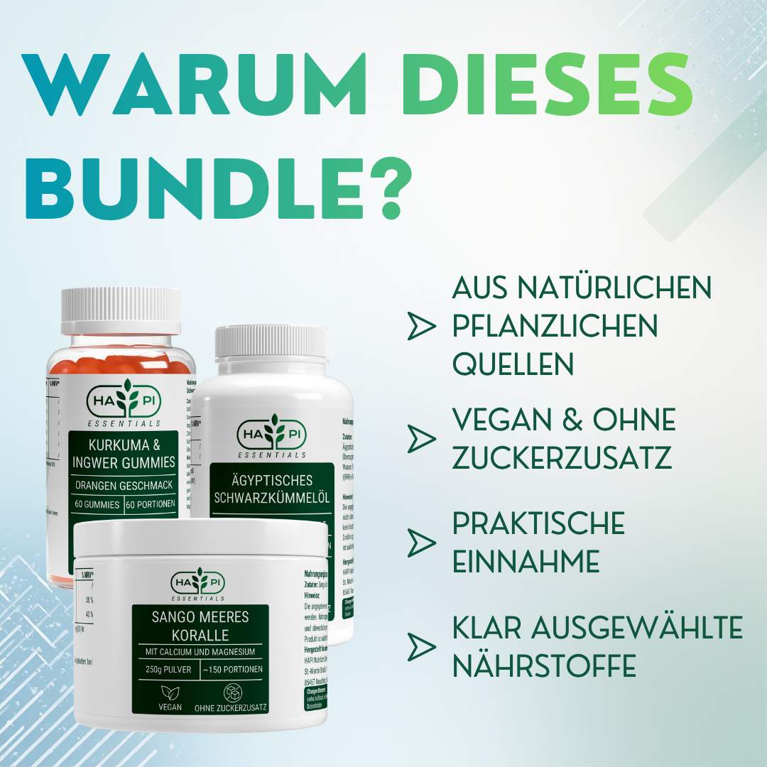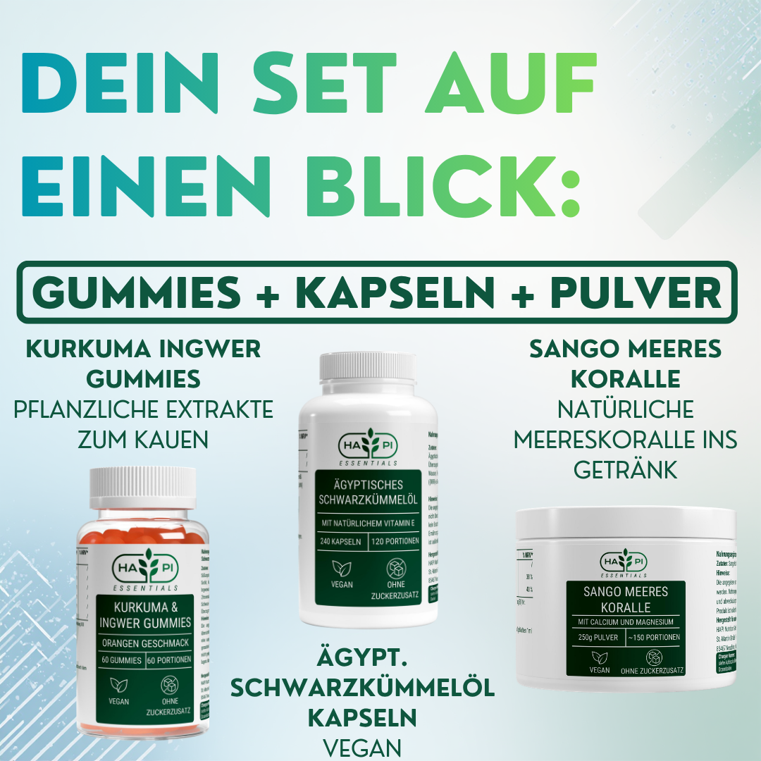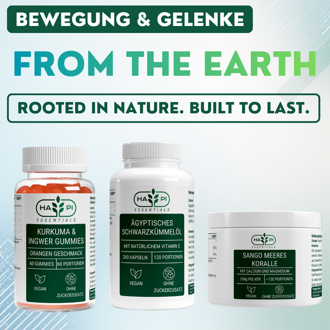 From The Earth Bundle – drei Produkte aus natürlichen Quellen in drei Formaten: Kurkuma + Ingwer + Schwarzer Pfeffer Gummies (60 Stk.) mit pflanzlichen Extrakten, Ägyptisches Schwarzkümmelöl (240 vegane Softgels) aus kaltgepresstem Schwarzkümmelöl sowie Sango Meeres Koralle Pulver (250 g) aus natürlicher Meereskoralle.