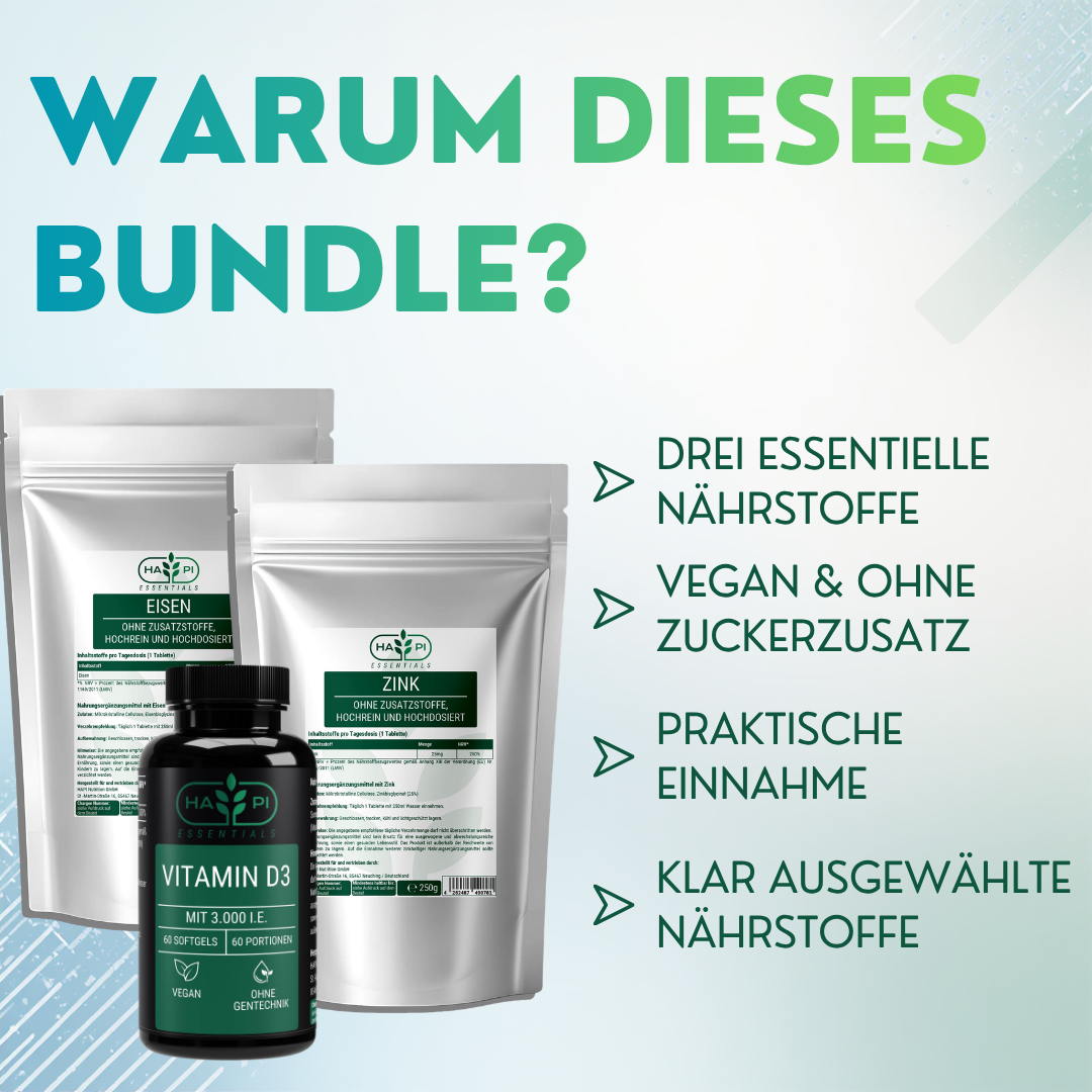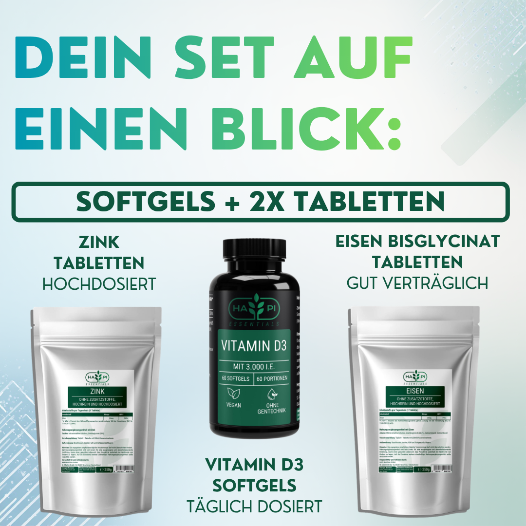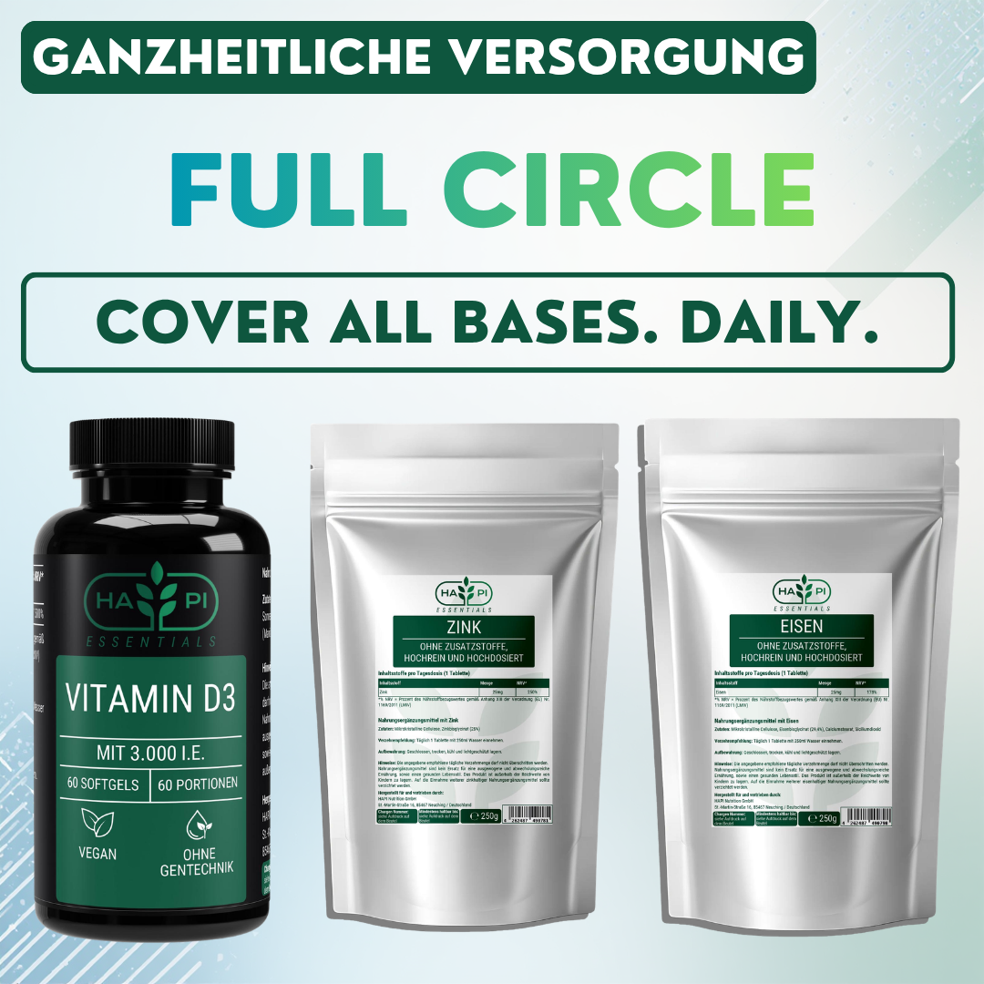Full Circle Bundle – drei Produkte für eine breite tägliche Versorgungsroutine: Eisen Bisglycinat Tabletten (500 Stk.), wobei Eisen zur normalen Bildung von roten Blutkörperchen beiträgt, Vitamin D3 3.000 I.E. Softgels (60 Stk.), wobei Vitamin D zur normalen Funktion des Immunsystems sowie zur Erhaltung normaler Knochen beiträgt, und Zink Bisglycinat Tabletten (500 Stk.) mit Zink, das zu einem normalen Makronährstoffstoffwechsel beiträgt.