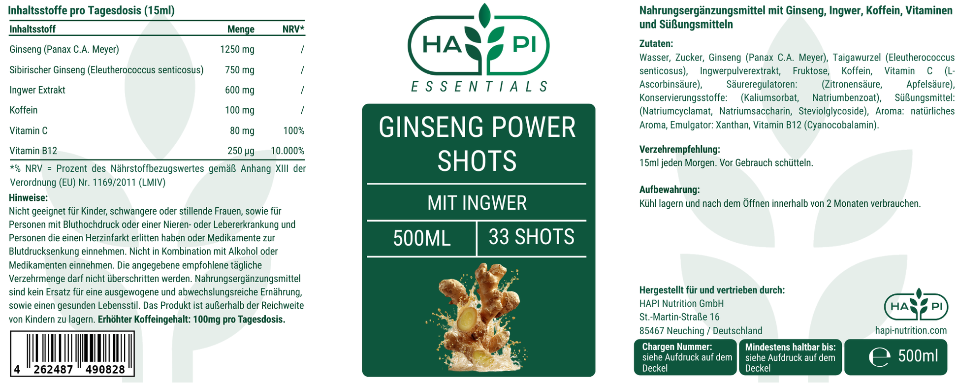 Die Ginseng Power Shots sind dein morgendlicher Wachmacher-Shot mit Ritual-Charakter – flüssige Energie-Vibes für einen aktiven Tag, ohne künstliche Hektik-Kommunikation. Die Rezeptur kombiniert Panax Ginseng, Taigawurzel, Ingwer, Vitamin C und Vitamin B12 mit Koffein zu einem Shot, der Fokus, Wachheit und dein Bewusstsein für einen kraftvollen Start in den Tag begleitet.