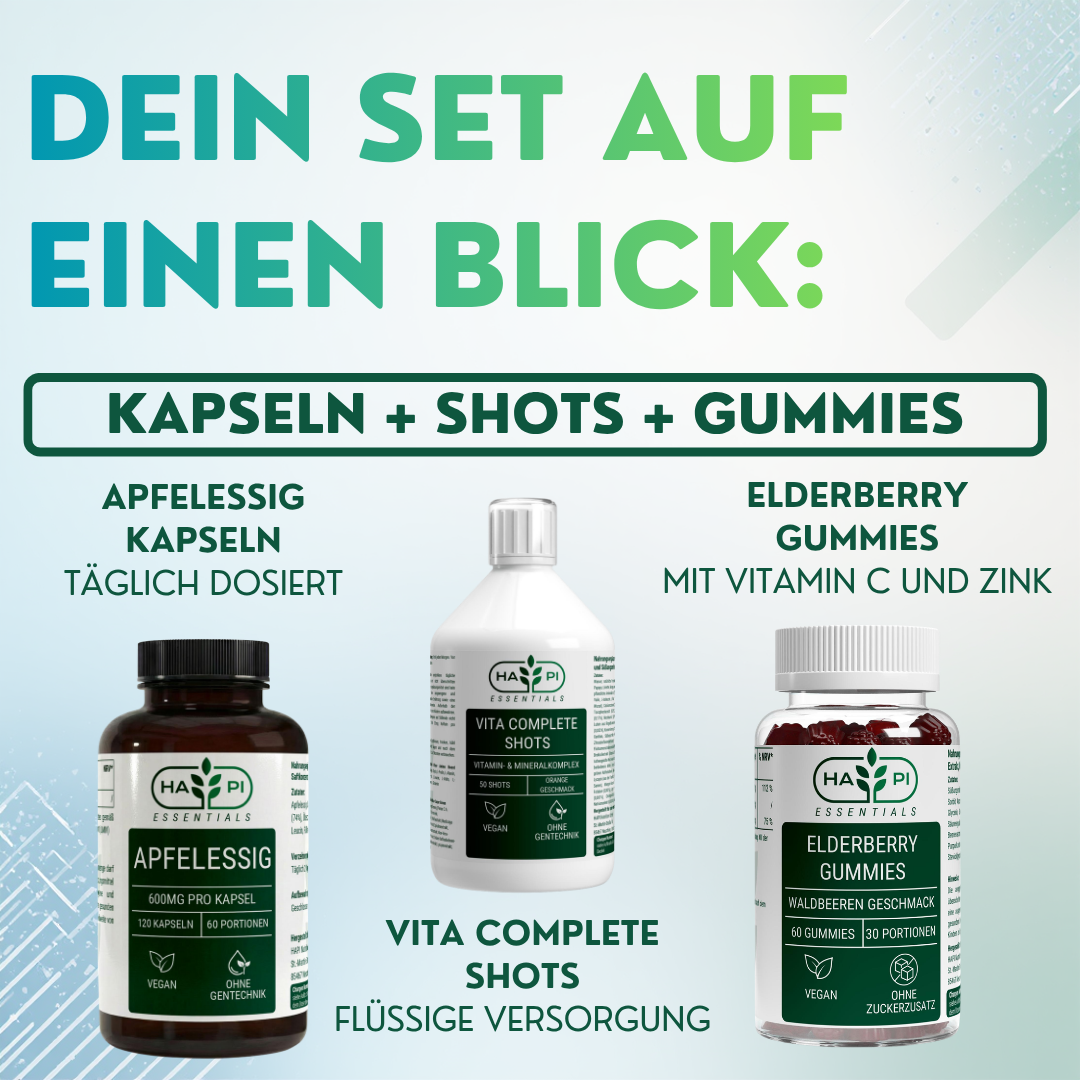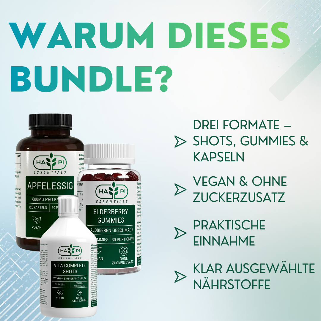 Groundwork Bundle – die Basis in drei Produkten: Apfelessig Extrakt Kapseln (120 Stk., 600 mg je Kapsel) aus konzentriertem Apfelessig-Extrakt, Elderberry + Vitamin C + Zink Gummies (60 Stk.) mit Vitamin C und Zink, die zur normalen Funktion des Immunsystems beitragen, sowie Vita Complete Shots (500 ml, 50 Shots) als flüssige Alltagsergänzung.