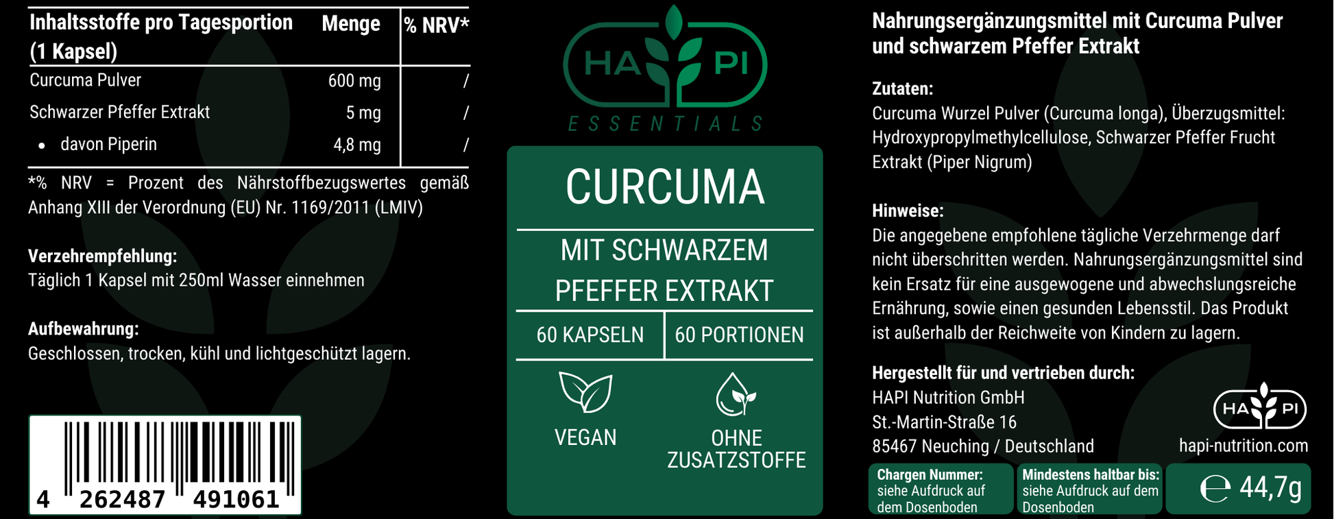 Deine Curcuma Kapseln passen so perfekt in den HAPI Spirit: klare, minimalistische Pflanzenformel, bewusst eingesetzter Schwarzer Pfeffer und eine ehrliche Botschaft – kein Heilsversprechen, sondern ein goldener Begleiter für deinen achtsamen Alltag.