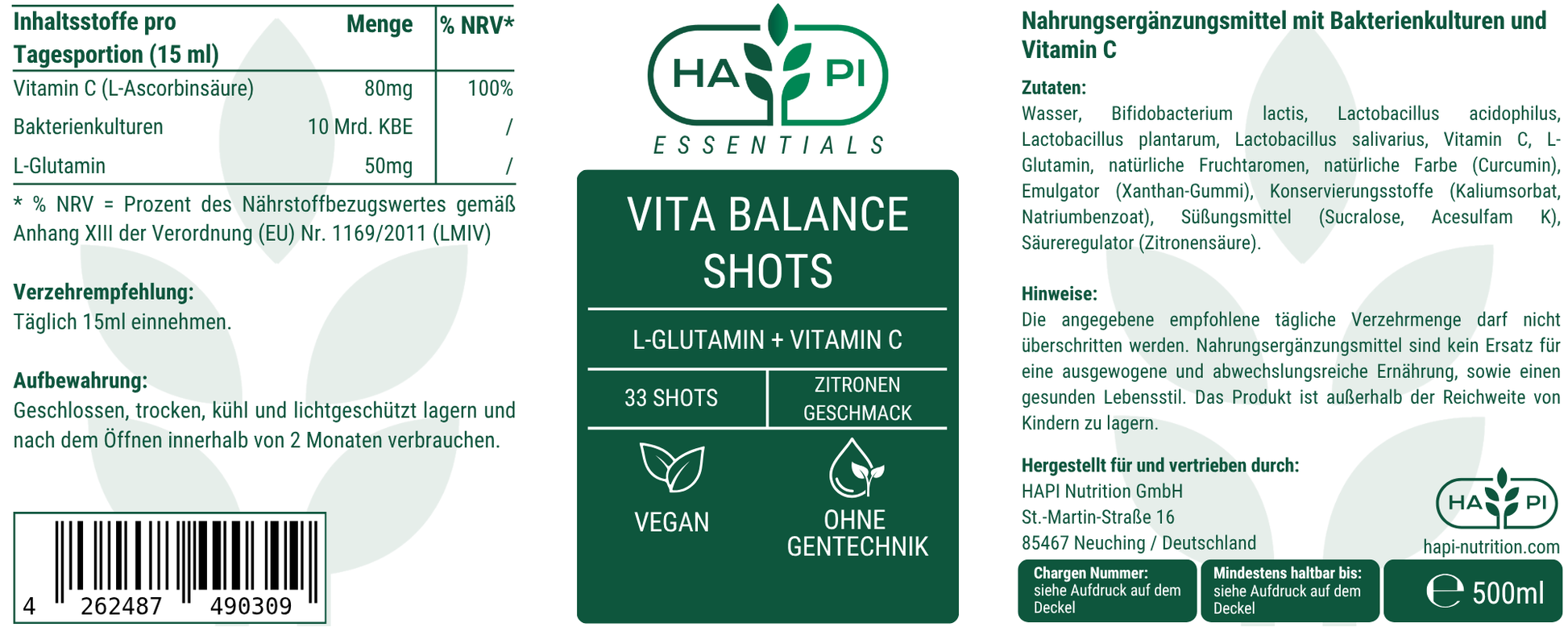 Vita Balance liefert 10 Milliarden koloniebildende Einheiten (KBE) aus vier ausgewählten Bakterienstämmen: Bifidobacterium lactis, Lactobacillus acidophilus, Lactobacillus plantarum und Lactobacillus salivarius. Dank innovativer Mikroverkapselung gelangen die Kulturen geschützt in den Darm. Ergänzt wird die Rezeptur durch Vitamin C und L-Glutamin.