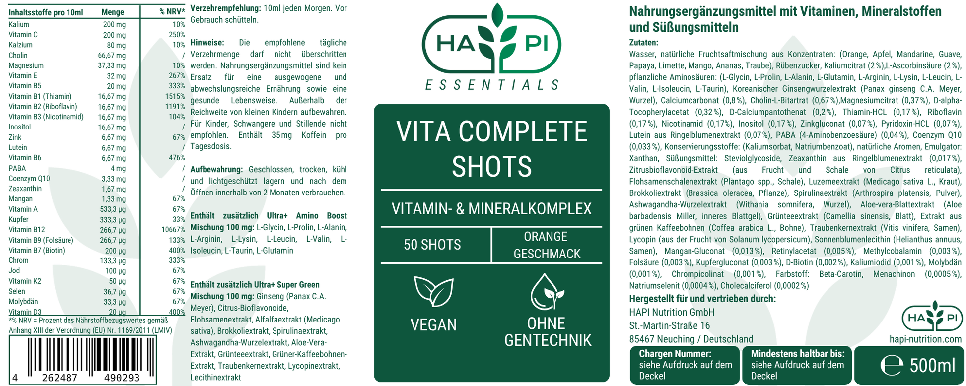 Vita Complete vereint ein breites Spektrum an Vitaminen, Mineralstoffen, Aminosäuren und Pflanzenextrakten in einem praktischen Shot. Ergänzt mit natürlichen Fruchtsäften schmeckt er angenehm frisch nach Orange und ist leicht in die tägliche Routine zu integrieren.