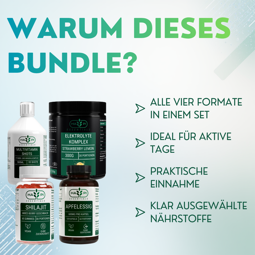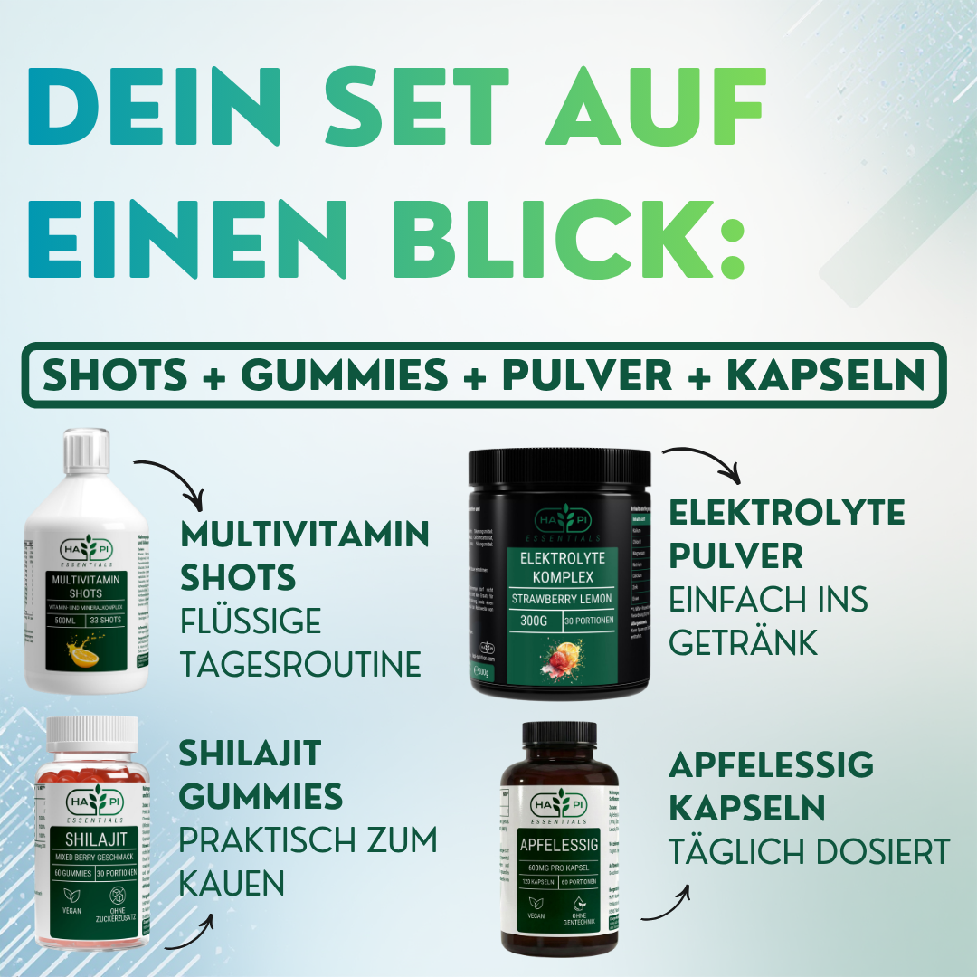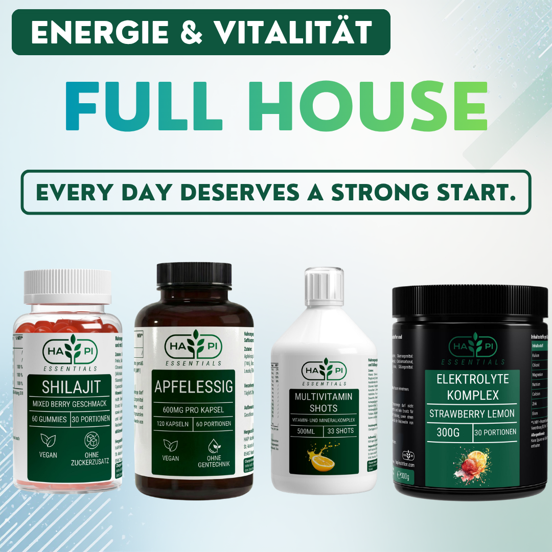 Full House Bundle – vier Produkte in vier verschiedenen Formaten: Shilajit Gummies 1000 mg + Vitamin C, B6, B12 (60 Stk.), wobei Vitamin B6 und B12 zu einem normalen Energiestoffwechsel beitragen, Multivitamin Shots (500 ml) als flüssige Tagesroutine, Elektrolyte Pulver Strawberry Lemon (300 g) mit Mineralstoffen sowie Apfelessig Extrakt Kapseln (120 Stk., 600 mg je Kapsel).